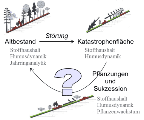 In Altbeständen wurden der Stoffhaushalt und die Reaktion der verschiedenen Baumarten auf Klimaextreme der Vergangenheit (Jahrringanalysen) erforscht, um daraus die Reaktion der Arten auf den fortschreitenden Klimawandel abzuleiten. Auf Katastrophenflächen wurden die Humus- und Nährstoffdynamik sowie der Wiederbewaldungserfolg untersucht, um die Rahmenbedingungen für eine Wiederherstellung der Schutzfunktionen festzustellen. Dazu wurden verschiedene Wiederbewaldungsstrategien getestet und Daten zu Wachstum und Ernährung der Kunst- und Naturverjüngung erhoben (Abb. 1).