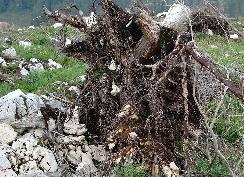 Kalkalpine Standorte besitzen in der Regel einen kritischen Nährstoffhaushalt. Bei fehlender Vorausverjüngung ist nach großflächigen Störungen in den ersten Jahren mit hohen Nährstoffverlusten zu rechnen. Je ungünstiger der Standort und je weniger Vorausverjüngung vorhanden ist, desto schwieriger ist das Nährstoffkapital und die Wasserspeicherkapazität in hohem Umfang für den Folgebestand zu sichern. Auf Humus-Carbonatböden besteht im Extremfall die Gefahr der Verkarstung, womit der Waldstandort und seine Schutzfunktion komplett verloren geht (Abb. 2). - Welche Wiederbewaldungsstrategien erscheinen erfolgsversprechend – auch vor dem Hintergrund des Klimawandels?