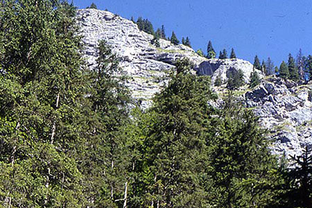 Auf Humus-Carbonatböden scheint die Saat aufgrund ungünstiger mikroklimatischer Bedingungen (starkes Aufheizen des dunklen Humus) ungeeignet zu sein. Pflanzung ist dagegen eine erfolgsversprechende Wiederbewaldungsmaßnahme. Pionierbaumarten wie Vogelbeere, Mehlbeere oder Grauerle zeigen wie die Lärche hohe Wachstumsraten im Vergleich zu Fichte, Tanne und Buche. Pioniere helfen die frei werdenden Nährstoffe im Ökosystem zu halten und sind daher unbedingt an der Wiederbewaldung zu beteiligen. Bei allen Baumarten ist für den Pflanzerfolg die sorgfältige Auswahl des Kleinstandortes sehr wichtig. - Mit welchen Zeiträumen ist nach großflächigen Störungen bis zur Wiederherstellung der Schutzfunktion (Wasserschutz, Lawinenschutz, …) zu rechnen?