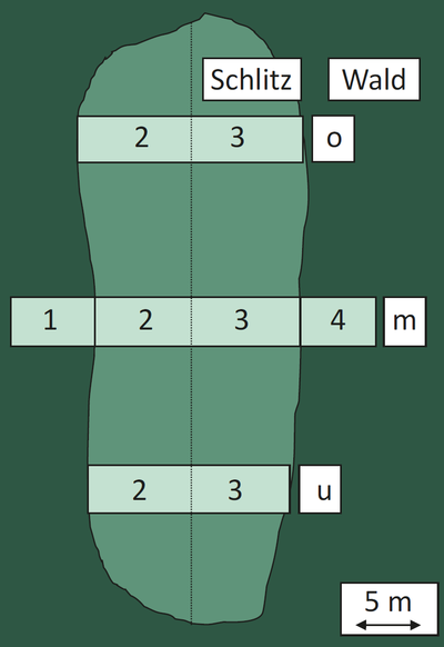Die Schlitze sind durchschnittlich 55 m lang (Bereich von 21 bis 114 m) und 16 m breit (7 bis 28 m). Die Erhebungen wurden in drei parallelen Transekten senkrecht zur Längsachse jedes Schlitzes durchgeführt (Abb. 2). Der obere (o) und der untere Transekt (u) sind in zwei Teilabschnitte unterteilt, der mittlere Transekt (m) in vier Abschnitte, wobei zwei davon im angrenzenden Waldbestand liegen. Auf den Transekten erfassten wir sämtliche Verjüngung nach Baumart und Grössenklasse, ausgenommen einjährige Keimlinge. Zusätzlich erhoben wir Schäden wie Verbiss und Schwarzer Schneeschimmel(Herpotrichia juniperi).