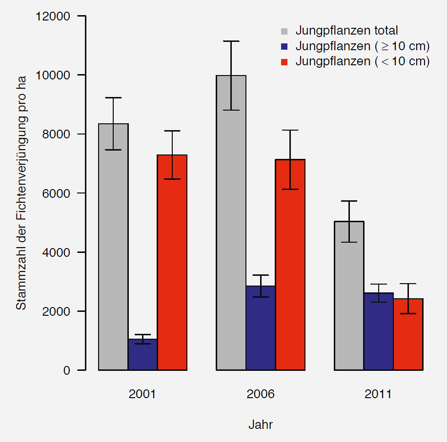 Die starke Abnahme der unter 10 cm grossen Verjüngung von 2006 bis 2011 kann nur mit einer hohen Mortalität erklärt werden. Eine zusätzliche Erhebung an 284 individuell beobachteten Fichten-Jungpflanzen bestätigte dies: von 2001 bis 2011 starben 85% dieser Pflanzen.