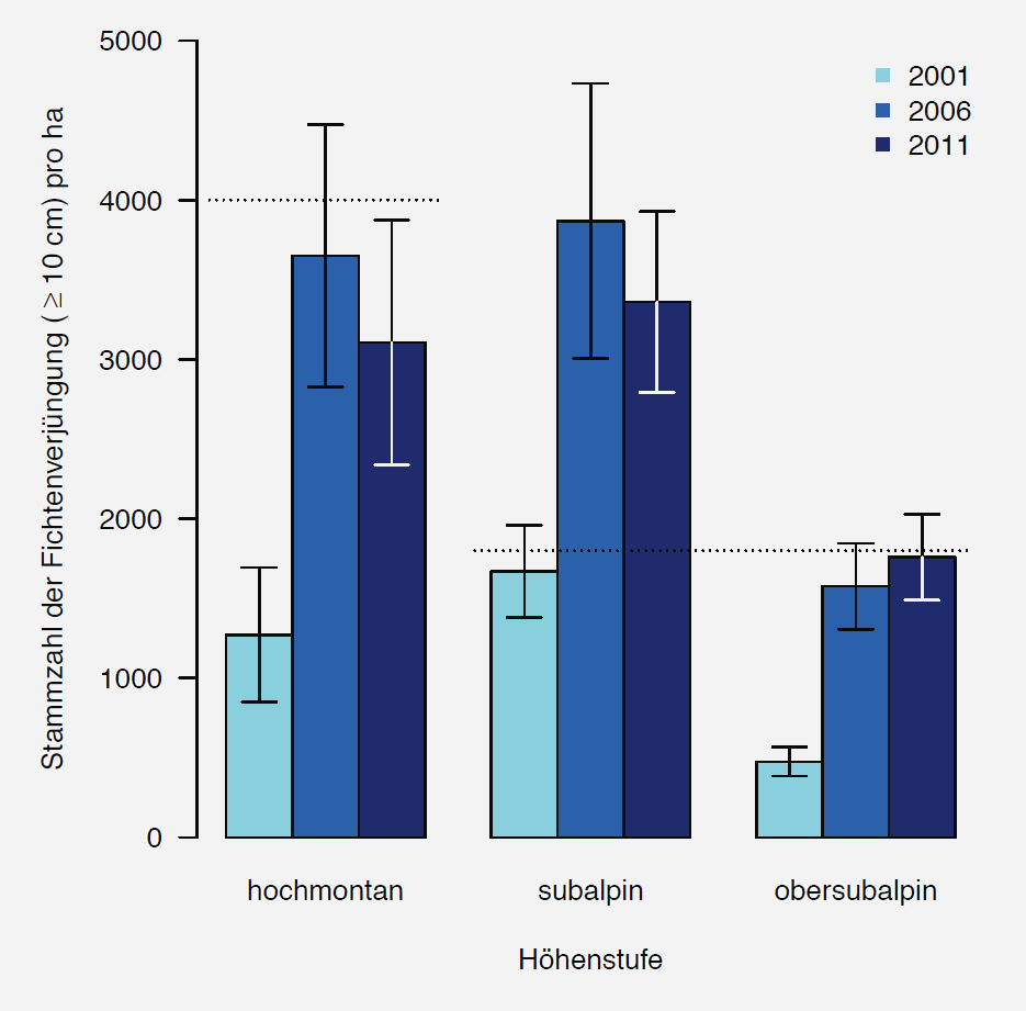 Ott et al. (1997) sowie Bühler (2005) haben Sollstammzahlen für mindestens 10 cm grosse Fichten-Jungpflanzen in Fichten-Gebirgswäldern entwickelt. Sie liegen bei 4000 Stück pro ha für hochmontane Wälder und bei 1800 pro ha für subalpine und obersubalpine Wälder. Rund 15 bis 20 Jahre nach dem Holzschlag sind diese Sollstammzahlen im Durchschnitt der Schlitze in der subalpinen Stufe deutlich und in der obersubalpinen Stufe knapp erreicht, in der hochmontanen Stufe aber verfehlt (Abb. 4). Wenn man die Sollstammzahl auf jeden Schlitz anwendet, ergibt sich folgendes Bild: In der hochmontanen Stufe erreichen 4 von 11 Schlitzen, in der subalpinen Stufe 7 von 10 und in der obersubalpinen Stufe 6 von 15 Schlitzen die Sollstammzahl. Die Sollstammzahlen werden also insgesamt in 17 von 36 Fällen erreicht.