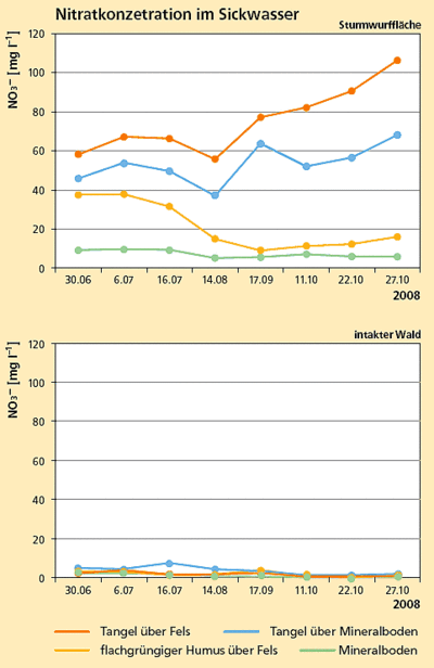 Unter den beiden Bodenformen "flachgründiger Humus über Fels" und "Mineralboden" lagen die Werte der Nitratkonzentrationen zwar deutlich unter denen der Tangelvarianten, aber dennoch wesentlich höher als im intakten Wald.