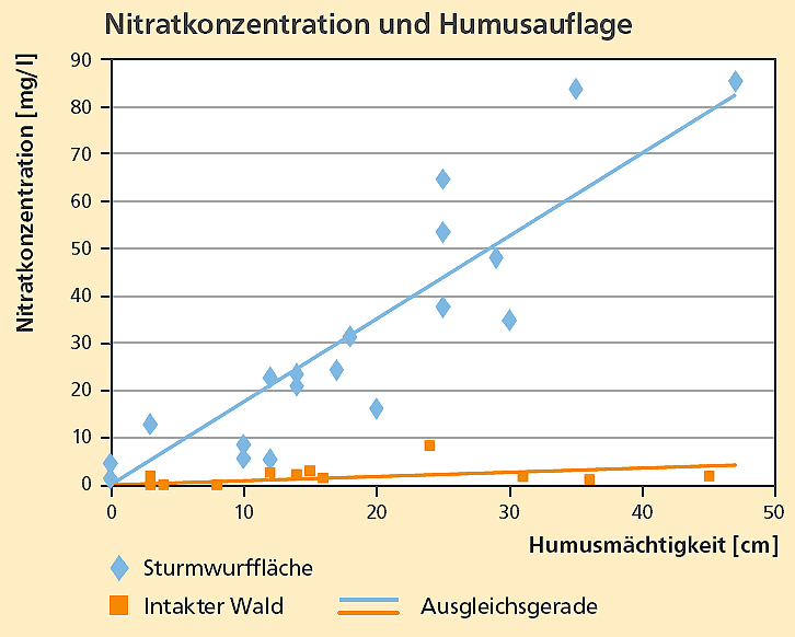 Bei der Probenahme im August ließen sich auf der Sturmwurffläche über 80 Prozent der Variabilität der Nitratkonzentration allein durch die unterschiedliche Humusmächtigkeit erklären. Mächtige Humusauflagen verursachen auch höhere Nitratkonzentrationen (Abbildung 3). Im intakten Wald gab es diesen Zusammenhang nicht. Hier wurden auch unter mächtigen Humusschichten nur geringe Nitratkonzentrationen gemessen. Die gemessenen hohen Nährstoffkonzentrationen werden aufgrund der flachgründigen Entwicklung der Böden schnell dem Vorfluter oder Grundwasser zugeführt.