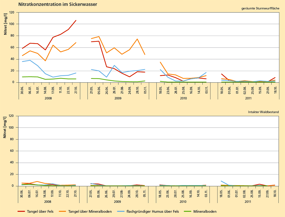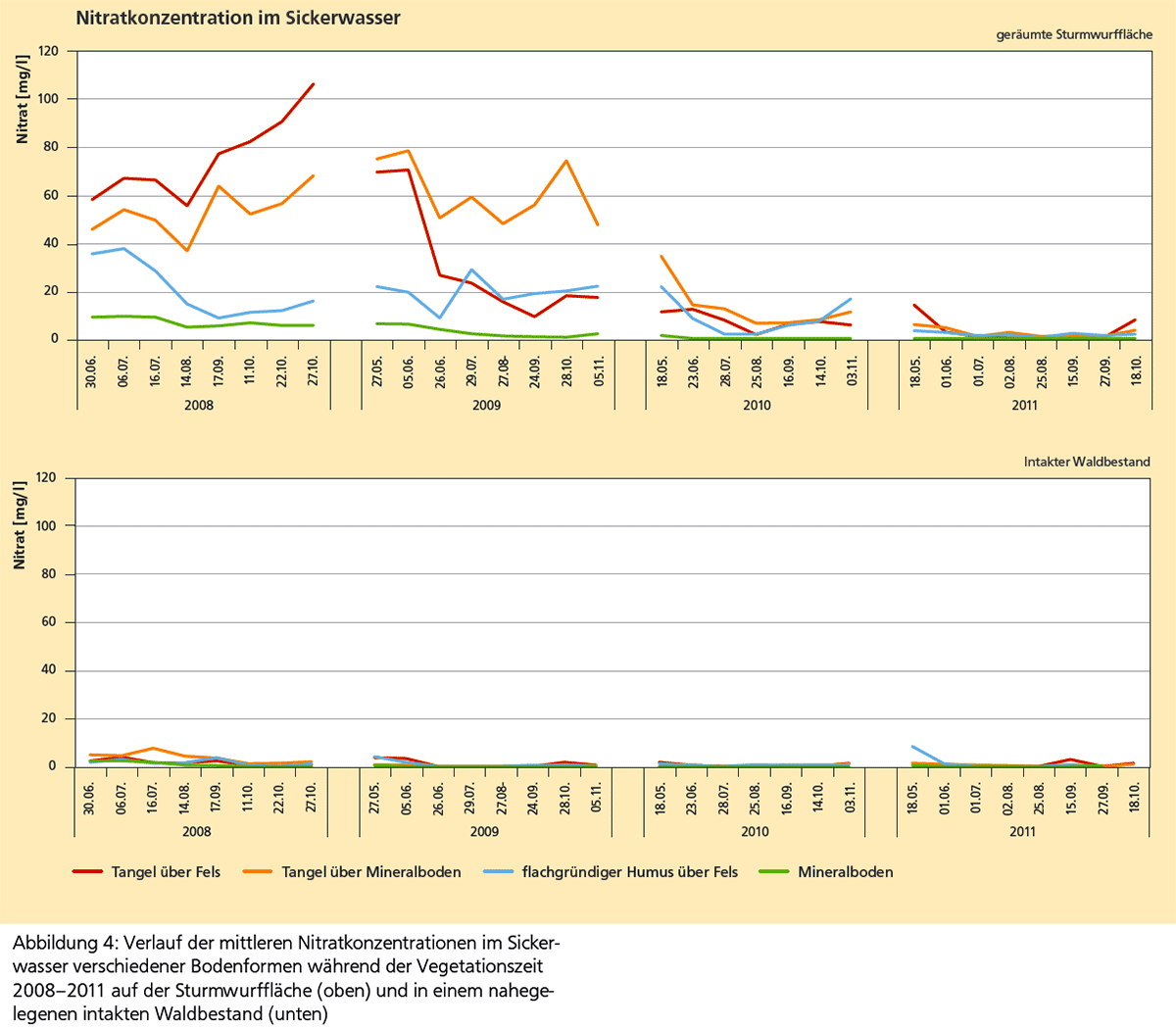 Die mittlere Nitratkonzentration war bis 2010 auf der geräumten Sturmwurffläche unter allen beprobten Böden viel höher als im intakten Wald (Abb. 4). Die höchsten Konzentrationen finden sich unter Tangelhumusauflagen. Vereinzelt wurden sogar Nitratkonzentrationen von bis zu 250 Milligramm pro Liter festgestellt; solch hohe Werte kennt man bisher nur von Kahlschlägen im Flachland. In den ersten drei Jahren nach der Katastrophe treten neben Stickstoff auch sehr hohe Verluste an Kalium, Schwefel und anderen Nährstoffen auf. Diese Nährstoffe fehlen der folgenden Waldgeneration.