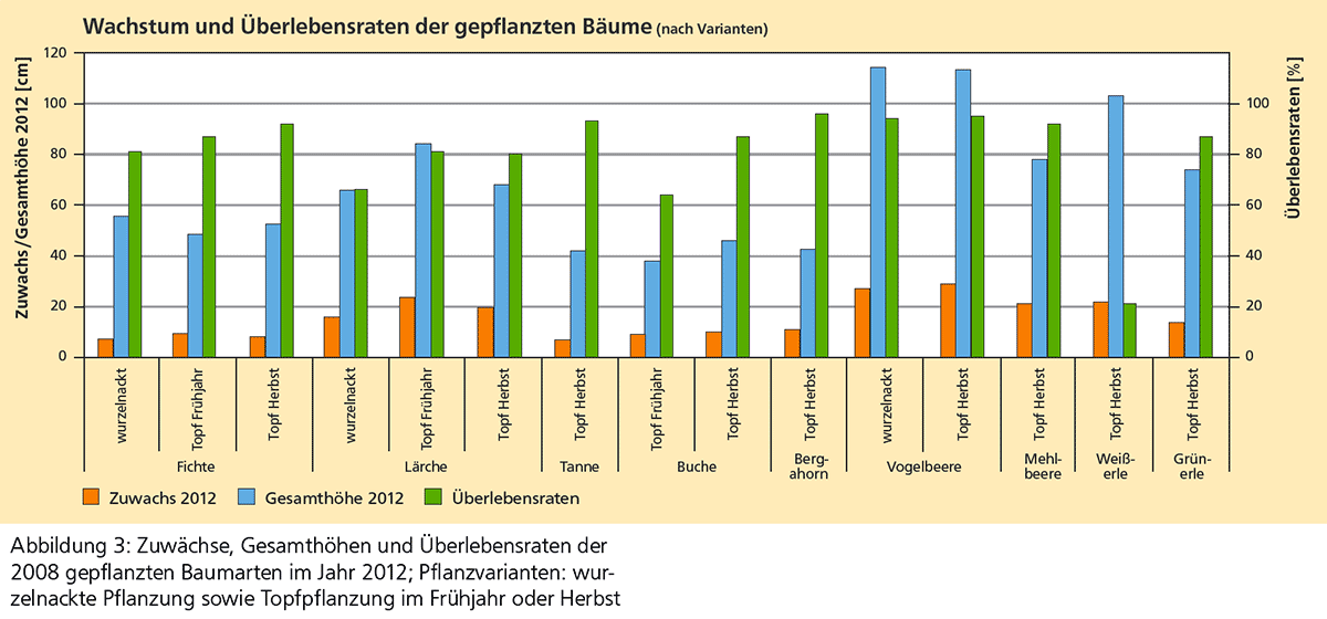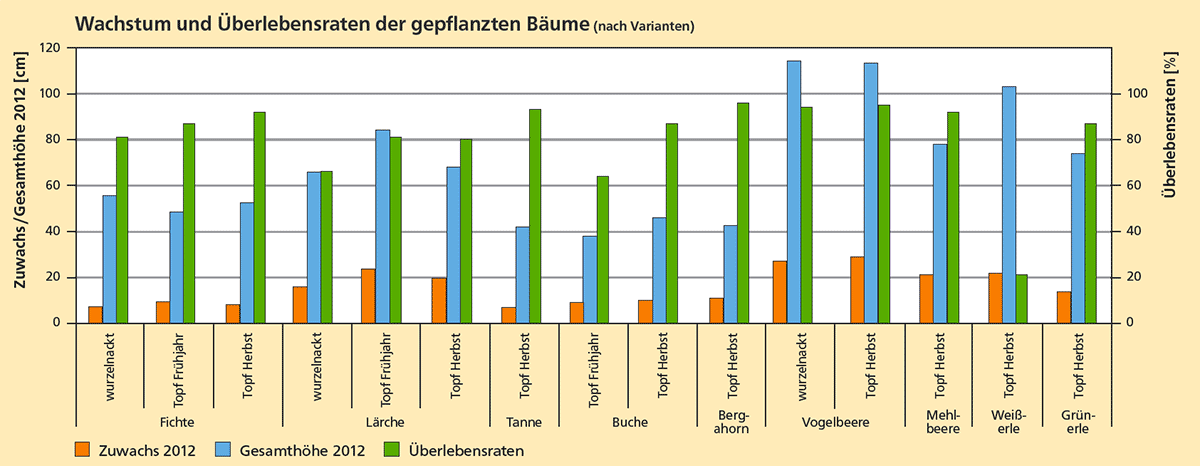 Die Überlebensraten waren bei Topf-/Containerpflanzen meist höher als bei den wurzelnackten Pflanzvarianten. Leidglich von den wurzelnackten Vogelbeeren überlebten ebenfalls über 90 Prozent. Bei den Herbstpflanzungen gab es – außer bei der Lärche – geringe Ausfälle als bei den Frühjahrspflanzungen (Abb. 2).