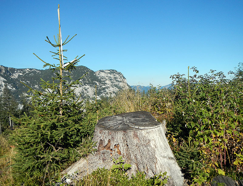Abb. 3: Sowohl die Naturverjüngung als auch die gepflanzten Bäume wachsen in der Nähe von Wurzelstöcken deutlich besser (Foto: M. Kohlpaintner).