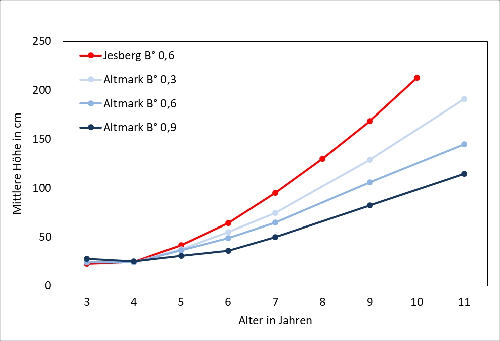 Nachdem die Bäume den Pflanzschock überwunden und sich etabliert hatten, sind die Einflüsse von Standort und Bestockungsgrad deutlich erkennbar (siehe Abb. 4). Die Küstentannen in Jesberg unter einem B° von 0,6 sind wesentlich wüchsiger als die vergleichbaren Bäume in der Altmark. Innerhalb der Versuchsfläche Altmark zeigt sich eine deutliche Differenzierung je nach Bestockungsgrad. Der signifikante Höhenunterschied zwischen den Küstentannen der Variante B° 0,6 und der Variante B° 0,3 im Alter 11 beträgt 46 cm. Unabhängig von der Standortsgüte konnte auf allen Flächen ein signifikanter Zusammenhang zwischen Höhenzuwachs und relativer Beleuchtungsstärke (Indirect Site Factor [ISF]) nachgewiesen werden. Vergleichbar wie die Höhen entwickeln sich auch die Durchmesser (gemessen am Wurzelhals 5 cm über dem Boden). Die Küstentannen in Jesberg sind bei gleichem Alter aufgrund des besseren Standorts deutlich dicker als die Bäume in der Altmark. Innerhalb der Versuchsfläche Altmark ist auch der Unterschied im Wurzelhals-Durchmesser zwischen der Variante B° 0,6 und B° 0,3 im Alter 11 signifikant und beträgt 0,9 cm.