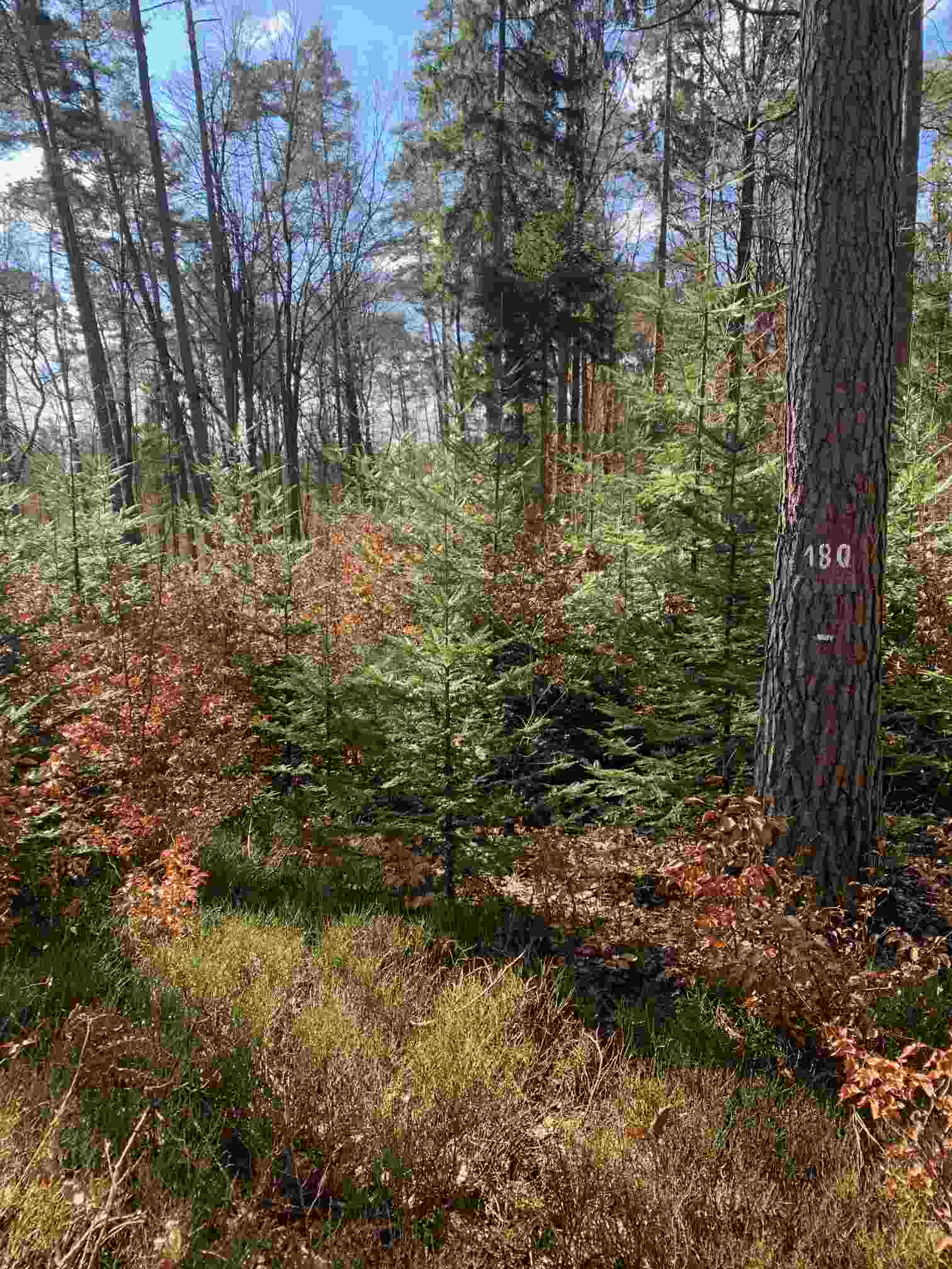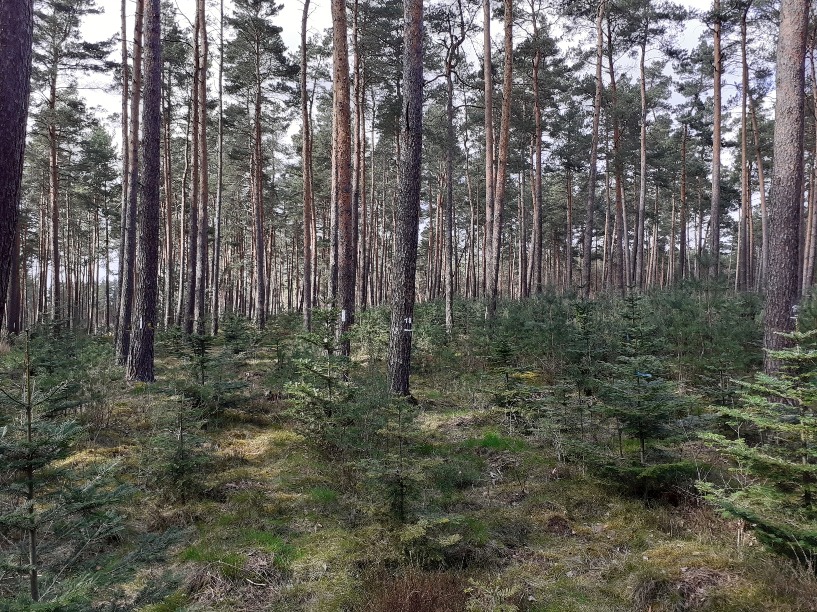 Auf der Versuchsfläche in der Altmark liegt die relative Beleuchtungsstärke (ISF) je nach Bestockungsgrad zwischen 41 % (B° 0,9) und 61 % (B° 0,3) und sollte den Lichtansprüchen der Küstentanne eigentlich genügen. Der Schirm der Altbäume hat eine Reihe positiver Eigenschaften, wie Verdunstungsschutz, Frostschutz oder Eindämmen der Begleitvegetation. Doch neben diesen vorteilhaften Eigenschaften wirkt er sich auch negativ auf das Wachstum der Pflanzen aus, weil er die Lichtzufuhr verringert und Niederschläge zurückhält (Interzeption). Zudem erhöhen die Wurzeln der Altbäume die Konkurrenz um Wasser und Nährstoffe. Diese Effekte werden in der Altmark deutlich. Der Standort weist in der Vegetationszeit geringe Niederschläge und eine hohe Verdunstungsrate auf, also eine schlechte klimatische Wasserbilanz (KWB). Der Boden verfügt über eine geringe Wasserhaltefähigkeit und besitzt dadurch eine niedrige nutzbare Feldkapazität (nFK). Aus den beiden Größen - Klimatische Wasserbilanz plus nutzbare Feldkapazität - berechnet sich die Standortswasserbilanz (KWB + nFK = SWB) für den Bezugszeitraum 2041 bis 2070. Diese ist auf der Versuchsfläche in der Altmark negativ. Sie beträgt -222 mm und kann als Maß für die Trockenheit interpretiert werden. Nach der Meinung von Expertinnen und Experten wird auf Standorten mit einer Standortswasserbilanz zwischen -150 und -350 mm das Trockenstressrisiko für die Küstentanne als „mittel“ eingeschätzt. In diesem Bereich ist eine Entwicklung des Kiefernbestandes hin zum sogenannten Bestandeszieltyp (Sachsen-Anhalt) aus führender Küstentanne mit Buche möglich.