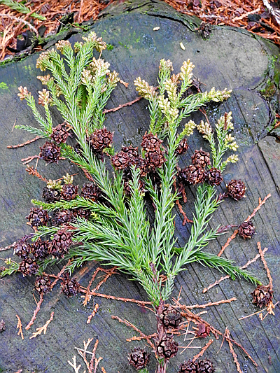 Abb. 2: Zweig mit männlichen Blüten und vorjährigen Zapfen. Foto: N. Tennhoff