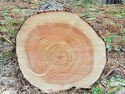 Abb. 4: Stirnseite eines frisch gefällten Stammes; Arboretum Burgholz (Abt. 426 F). Foto: N. Tennhoff