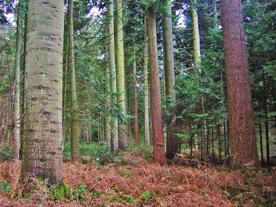 Abb. 3: Mischbestand von Edeltanne mit Riesenmammutbaum und Großer Küstentanne im Arboretum Burgholz bei Wuppertal. Foto: U. Nolden-Seemann