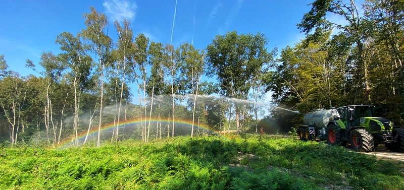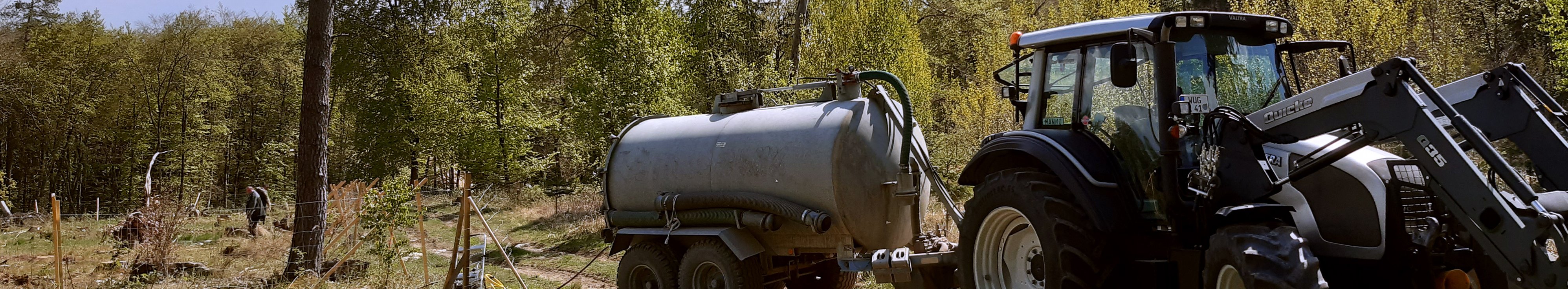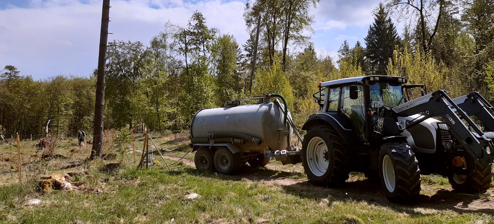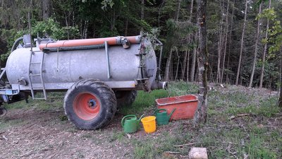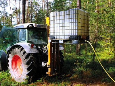 Abb. 1: Sogenannte "Feuerwehrlösung". Über große Wassertanks, die an den Rand der Kulturfläche oder auf die Rückegasse gebracht werden, kann das Wasser mit Pumpen (Druckspritzen, Wasserkanonen, Leitungen) auf die gesamte Fläche verteilt und gespritzt werden (Foto: Stadt Viersen).