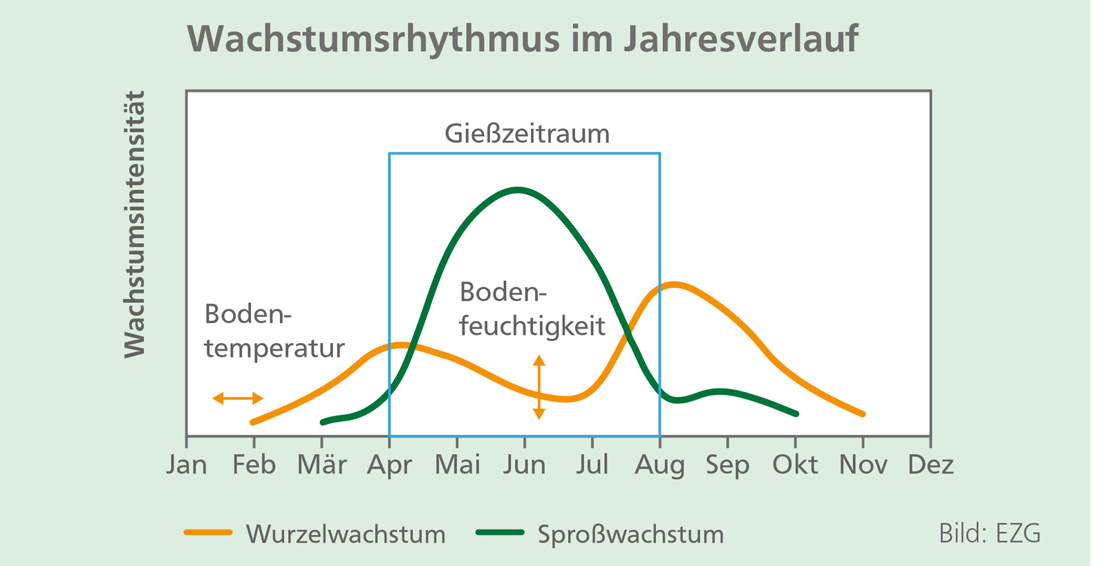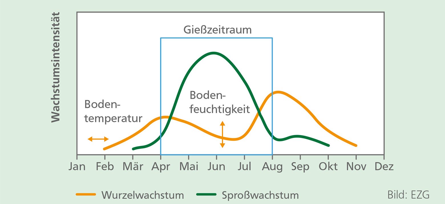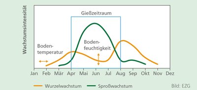 Zentrale Erfolgsfaktoren für die Bewässerung sind daher der richtige Zeitpunkt, die richtige Menge und die richtige Dauer. Der Gießzeitraum (s. Grafik) ist gekennzeichnet durch eine hohe Wurzelaktivität und einen hohen Wasserverbrauch infolge des Pflanzenwachstums. Je nach Bodentemperatur beginnt das Wurzelwachstum früher oder später und ist im Sommer in Abhängigkeit von der Bodenfeuchtigkeit niedriger oder höher. Verschiedene Bewässerungsmethoden finden Sie im Merkblatt selbst näher erleutert.
