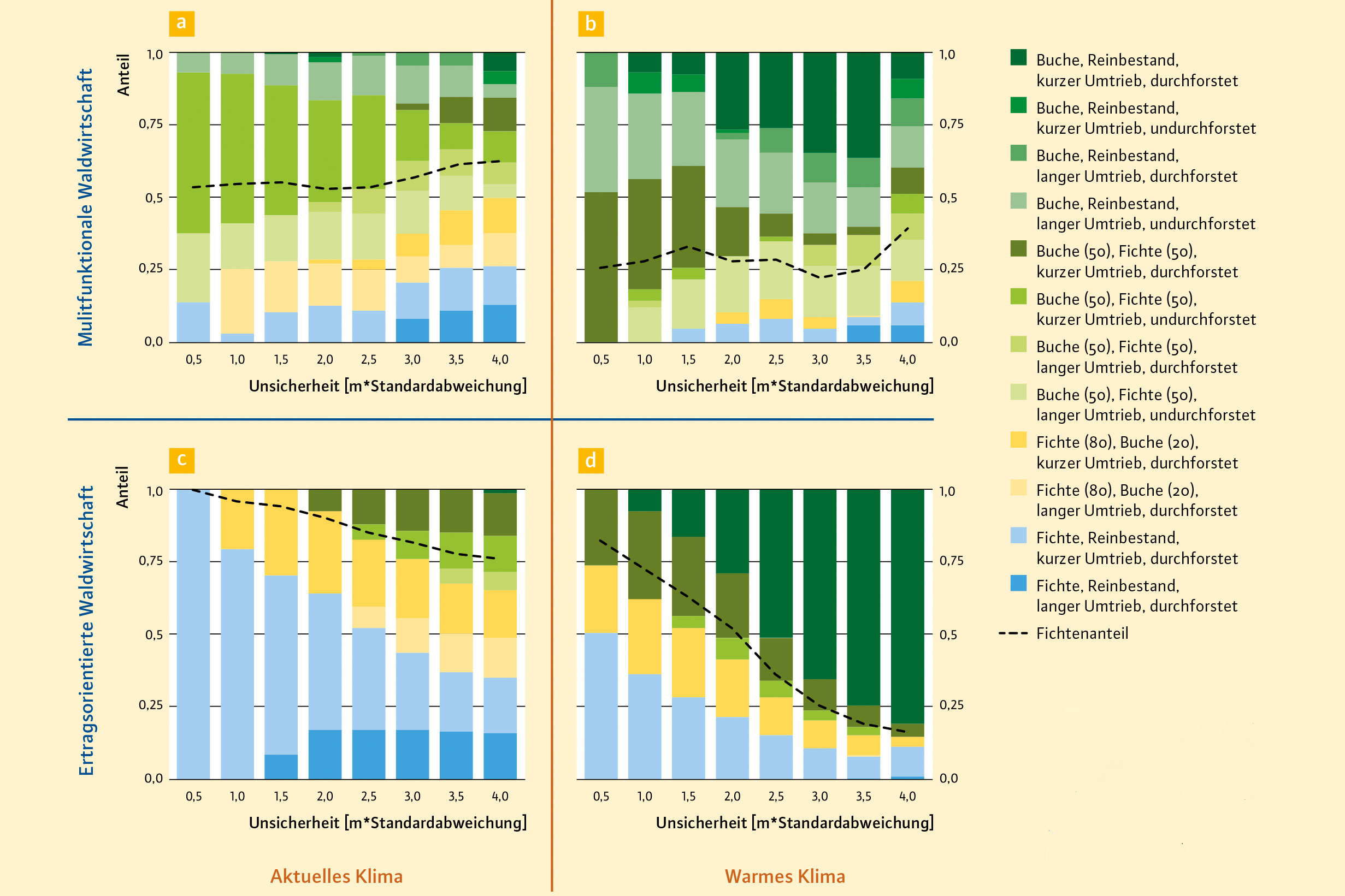 Diagramm 1c zeigt, dass ein ertragsorientierter Betrieb unter guten Wachstumsbedingungen für die Fichte hohe Anteile dieser Baumart, auch in Reinbeständen, anbauen würde. Dies gilt, sofern er das Risiko als mäßig einschätzt. Das erwartete Risiko (x-Achse der Diagramme a–d) ist in Einheiten der Standardabweichung des jeweiligen Zielindikators berücksichtigt.