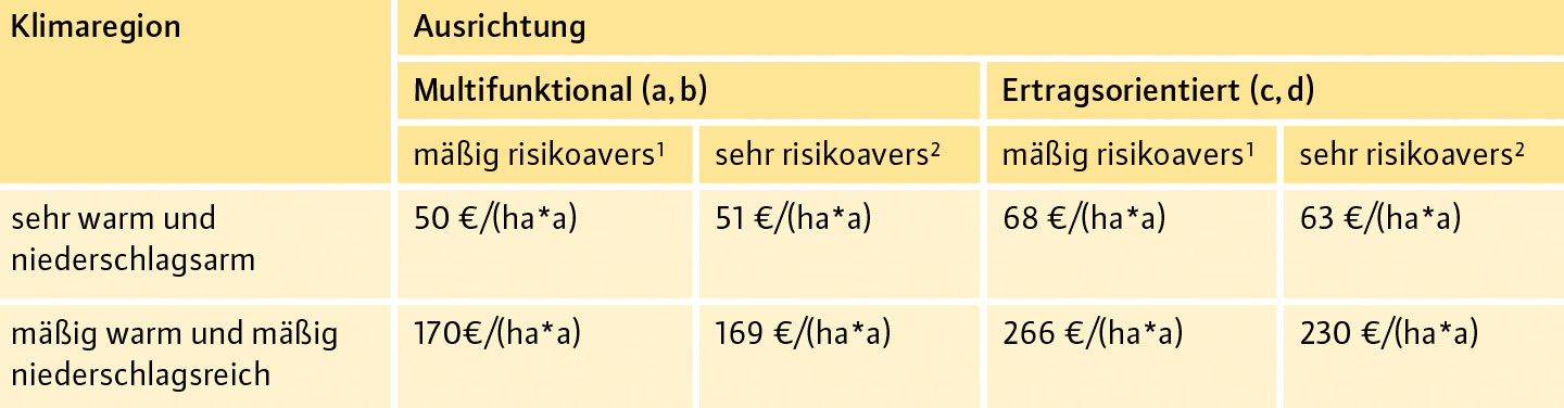 Möchten Forstbetriebe Risiken vermeiden, so müssen sie dafür ebenfalls eine (Risiko-)Prämie in Kauf nehmen. Dies drückt sich in den niedrigeren finanziellen Überschüssen bei den sehr risikoaversen Strategien aus. Je höher das bisherige Ertragsniveau ist, umso größer ist diese Risikoprämie. Gleichzeitig ist aber festzuhalten, dass in gemischten Wäldern die Kosten für die Risikominderung sehr gering bis unbedeutend sein können, wie Abbildung 4 ebenfalls verdeutlicht