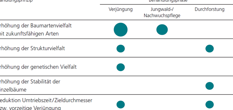 Tab. 1 – Schlüsselsituationen für die Anwendung der fünf waldbaulichen Handlungsprinzipien in verschiedenen Behandlungsphasen. Je grösser der Kreis, desto mehr bewirken gezielte Eingriffe. Die Handlungsprinzipien gelten unabhängig von der Betriebsform, auch wenn es im Dauerwald keine klar abgrenzbaren Behandlungsphasen gibt.