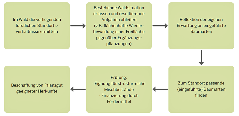 Da viele Regelungen ineinandergreifen und sich der Wissensstand zu nichtheimischen Baumarten kontinuierlich erweitert, ist vor dem konkreten Anbau einer Art die Beratung durch Fachpersonal empfehlenswert.
