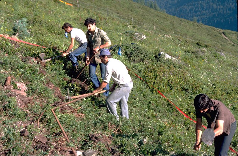 Im Jahr 1978 pflanzten Wissenschafter der Eidgenössichen Forschungsanstalt WSL auf drei Versuchsflächen je 600 Arven, die sie im Pflanzgarten S-chanf (Engadin) auf 1662 m ü. M. nachgezogen hatten. Bei der Pflanzung waren die Arven 12 bis 14 Jahre alt und durchschnittlich 78 cm hoch.Beim Ausheben wurde jeder Arve ein angemessener Erdballen um das Wurzelwerk belassen (Abb 1.).