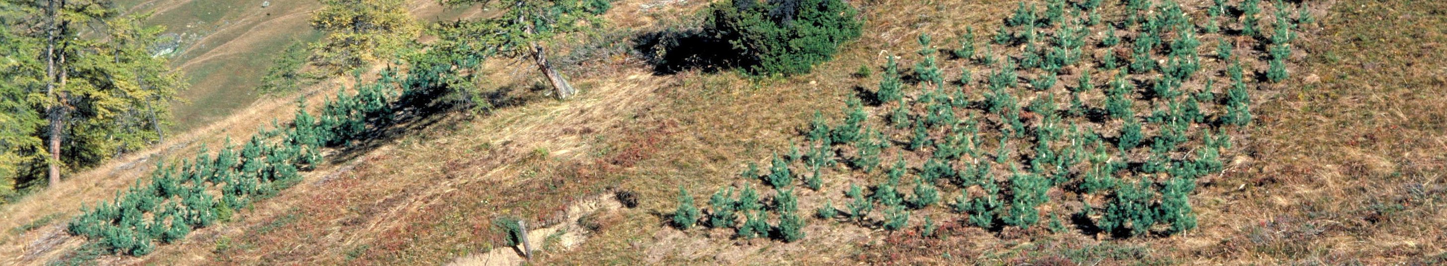 Die Grossarven wurden an der oberen Waldgrenze an einem südost-exponierten Hang gepflanzt, im kontinentalen Klima des Unterengadins. Als Schutz gegen das Schalenwild (Fegen) behandelten die Pflanz-Equipen die Bäume mit chemischen Mitteln. Die bedeutendste Ausfallursache auf diesem trockenen Standort war der Pflanzschock. Dies führte dazu, dass viele Bäume vertrockneten, wobei die grössten Ausfälle erst ca. vier Jahre nach der Pflanzung auftraten (Abb. 7). Auch Pilze und Insekten trugen zum Absterben der Arven bei.
