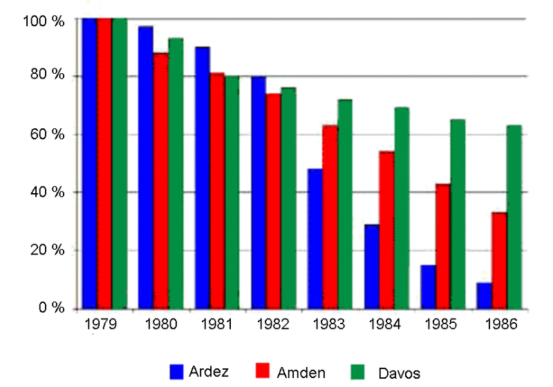 Dieses Feldexperiment hat die Grenzen von Grossballenpflanzungen an extremen Standorten deutlich aufgezeigt: Die Überlebesrate der Grossballen-Pflanzen während der Anwuchsphase zeigt, dass in den ersten acht Jahren 91% (Ardez), 67% (Amden) resp. 37% (Davos) der Arven abgestorben sind (Abb. 7). Bis heute, knapp 30 Jahre nach der Aufforstung, haben nur einzelne Grossarven am Stillberg bei Davos und oberhalb Amden am Mattstock überlebt. Am trockenen Standort bei Ardez sind inzwischen alle gepflanzten Bäume tot.