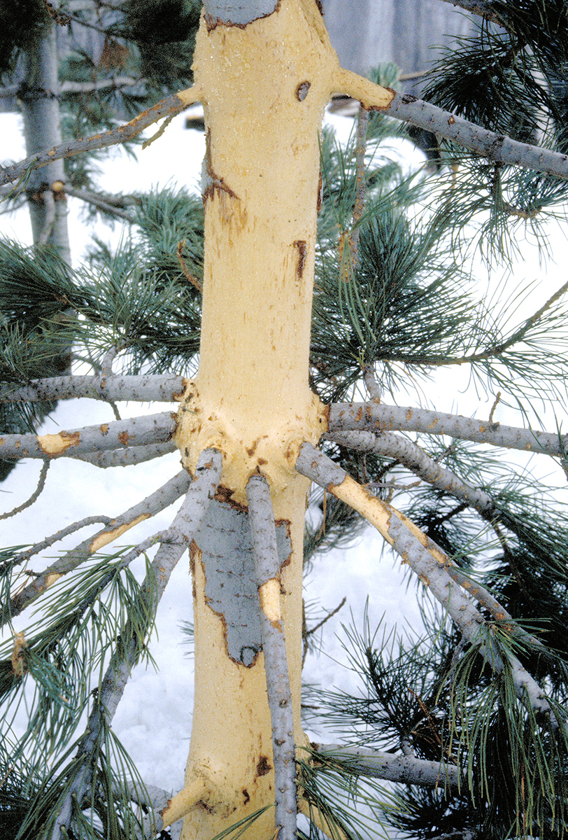 Am Mattstock oberhalb Amden wurden die Arven in einen typischen Gleitschneehang gepflanzt (Südhang mit Föhneinfluss). Trotz einer zusätzlichen Verankerung mit Holzpfählen drückte die gleitende Schneedecke die Bäumchen um und entwurzelte sie. Bei standfesteren Arven bewirkten die Schneebewegungen (Schneekriechen und Schneesetzung) Stammbrüche, Astbrüche und tiefe Schürfungen bis in den Holzkörper (Abb. 5). Verletzungen, Pflanzschock und Trockenheit verursachten in den ersten Jahren nach der Pflanzung eine hohe Mortalität. Später führten Pilzerkrankungen (Hochlagenpilze) und sekundärer Befall durch Borkenkäfer zu weiterem Absterben von Bäumchen. Sieben Jahre nach der Pflanzung lebte immerhin noch jede dritte Arve.