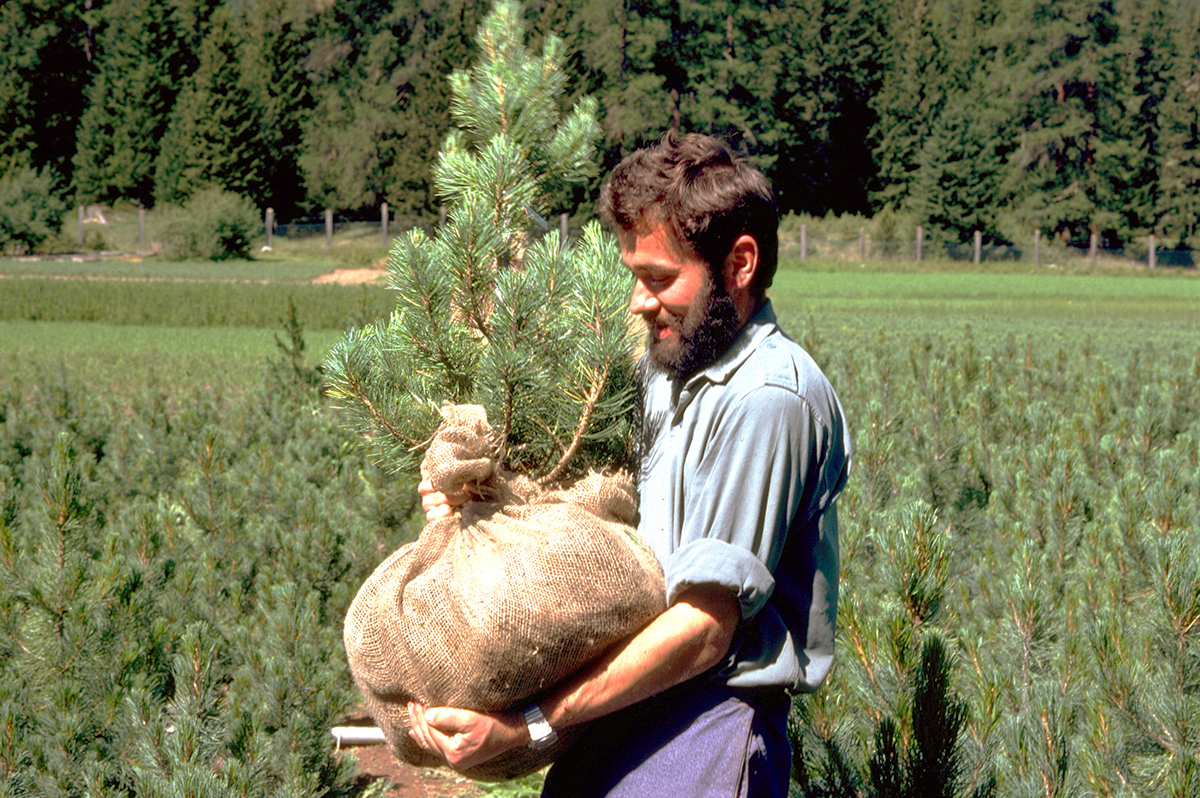 Die Wurzelballen enthielten ca. 14 Liter Gartenerde, was einem Ballendurchmesser von rund 35 cm entspricht. Die mit Jutetüchern fixierten Erdballen schützten beim Transport das Wurzelwerk vor dem Austrocknen. Der Transfer der Bäumchen vom Pflanzgarten in die Aufforstungsgebiete war enorm aufwändig: Für die Verteilung der Bäume im steilen Gelände verwendeten die Mitarbeiter Seilbahnen. Die von Hand ausgeführte Lochpflanzung erschien ihnen als das geeignetste Pflanzverfahren (Abb. 2).