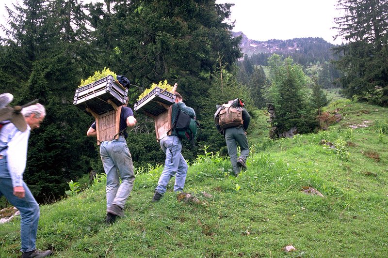 Nach dem Sturm Vivian wurden Aufforstungen mit Kleinballenpflanzen auf der Versuchsfläche Bugnai 1680 m ü. M. (1994) oberhalb Sedrun (GR) und im Firzwald 1450 m ü. M. (1993) oberhalb Obstalden (GL) mit je 1000 Lärchen realisiert. Die Ergebnisse aus diesen Aufforstungen nach 19 Jahren sind vielversprechend. Für schnell wachsende Baumarten wie Lärche, Bergföhre, Vogelbeere und Bergahorn hat sich dieses System bewährt.
