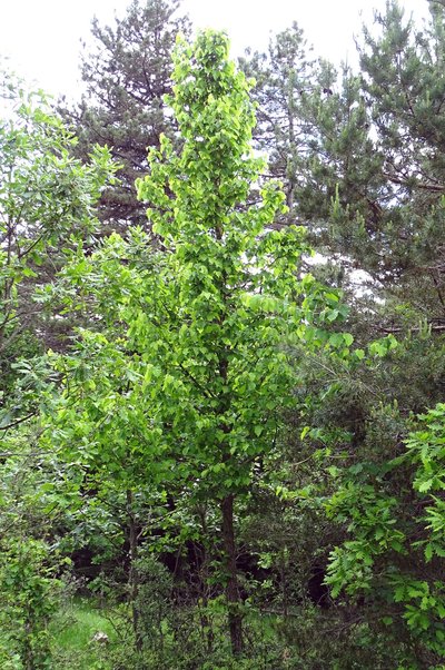 Der in Maljen besichtigte Bestand zeigt insgesamt gute Eigenschaften. Die Stammqualitäten sind sehr gut. Am zweiten Tag der Reise wurde der Bestand in Zlatibor besucht. Der Bestand wies gute Stammformen auf und kann als Saatgutquelle genutzt werden. Ein weiterer Bestand, der sich durch besonders gute Stammformen auszeichnet, wurde in der Nähe von Korsumlija besichtigt. Die Besonderheit bei diesem Vorkommen ist, dass die Baumhasel hier einen Anteil von 70 bis 80 % einnimmt. Dies ist besonders günstig für die Saatgutgewinnung, da viele Bäume beerntet werden können. Am vierten Tag der Reise besichtigten wir ein Baumhasel-Vorkommen in der Nähe von Kozijak (mazedonisch-serbische Grenze). Der Bestand mit ebenfalls guten phänotypischen Merkmalen stockt in einer Höhenlage von ca. 955 m ü. NN und ist von besonderer Bedeutung, da die Baumhasel hier auf einer Fläche von über 700 ha vorkommt. Am Nachmittag besichtigten wir das Vorkommen in Surdulica (Abb. 8). Dieser Bestand zeichnete sich durch hervorragende Stammqualitäten aus und lag bei der Bewertung deutlich über allen anderen Beständen, weshalb dieser unbedingt als zukünftiger Saatguterntebestand genutzt werden sollte. Einzelbäume weisen Höhen von bis zu 33 m auf. Am fünften Tag wurde der Bestand in Ozren besichtigt.