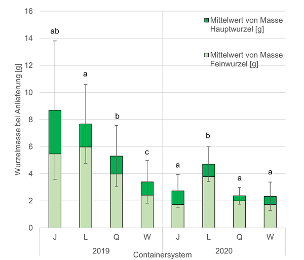 Abb. 2: Wurzelmassen bei Anlieferung. Dargestellt sind die Mittelwerte der Gesamtwurzel, getrennt nach Feinwurzel (hellgrün), Hauptwurzel (dunkelgrün) pro System (J = Jiffy®, L = LIECO, Q = QuickPotTM, W = Weichwand). Die Fehlerbalken zeigen die Standardabweichung und beziehen sich auf die Gesamtwurzelmasse. Die Signifikanzbuchstaben beziehen sich auf die Gesamtwurzelmasse innerhalb eines Jahres (n2019 = 20 pro System; n2020 =30 pro System). Grafik: J. Hanke