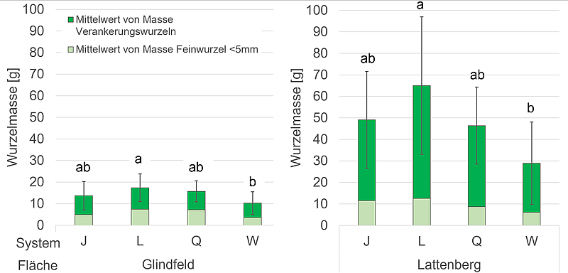 Abb. 3: Wurzelmassen nach zweijährigem Wachstum auf den Forschungsflächen. Dargestellt sind die Mittelwerte der Gesamtwurzel, getrennt nach Feinwurzel (hellgrün), Hauptwurzel (dunkelgrün) pro System (J = Jiffy®, L = LIECO, Q = QuickPotTM, W = Weichwand). Die Fehlerbalken zeigen die Standardabweichung und beziehen sich auf die Gesamtwurzelmasse. Die Signifikanzbuchstaben beziehen sich auf die Gesamtwurzelmasse innerhalb einer Fläche (n = 15 pro System und Fläche). Grafik: J. Hanke