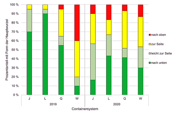Abb. 4: Prozentualer Anteil mit einer bestimmten Form der Hauptwurzel pro System bei Anlieferung (J = Jiffy®, L = LIECO, Q = QuickPotTM, W = Weichwand; n2019 = 20 pro System, n2020 =30 pro System) Grafik: J. Hanke