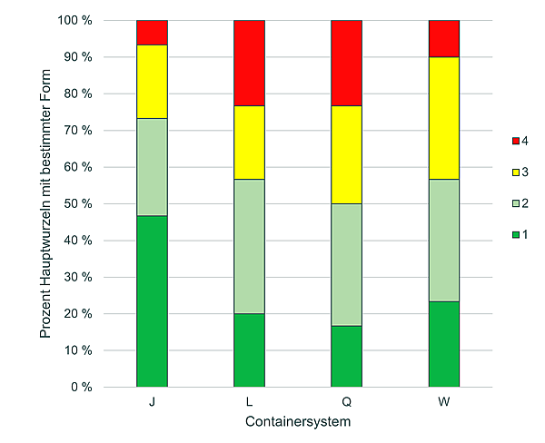 Abb. 5: Prozentualer Anteil mit einer bestimmten Form der Hauptwurzel pro System nach zweijährigem Wachstum auf den Forschungsflächen (1 = Tendenz nach unten, 2 = Knick nach unten, 3 = Knick zur Seite, 4 = gestaucht, oberflächlich weiterwachsend; J = Jiffy®, L = LIECO, Q = QuickPotTM, W = Weichwand; n = 30 pro System) Grafik: J. Hanke