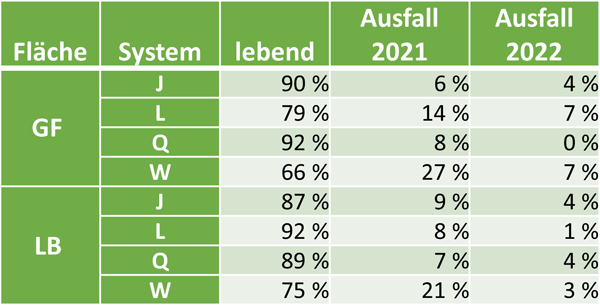 Tabelle 1: Prozentualer Ausfall pro Fläche und System im ersten (2021) und zweiten (2022) Wuchsjahr