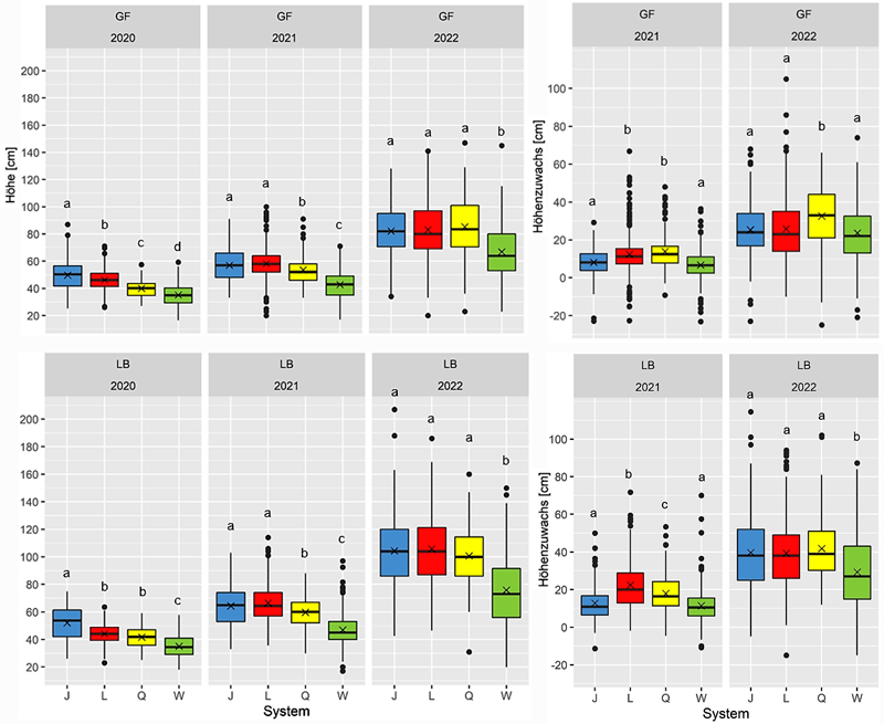 Abb. 6: Pflanzenhöhe und Höhenzuwachs pro Fläche (GF = Glindfeld, LB = Lattenberg), Jahr und Containersystem (J = Jiffy®, L = LIECO, Q = QuickPotTM, W = Weichwand). Unterschiedliche Buchstaben über den Boxen zeigen signifikante Unterschiede zwischen den Systemen innerhalb des betreffenden Jahres und der Fläche an. Grafik: J. Hanke