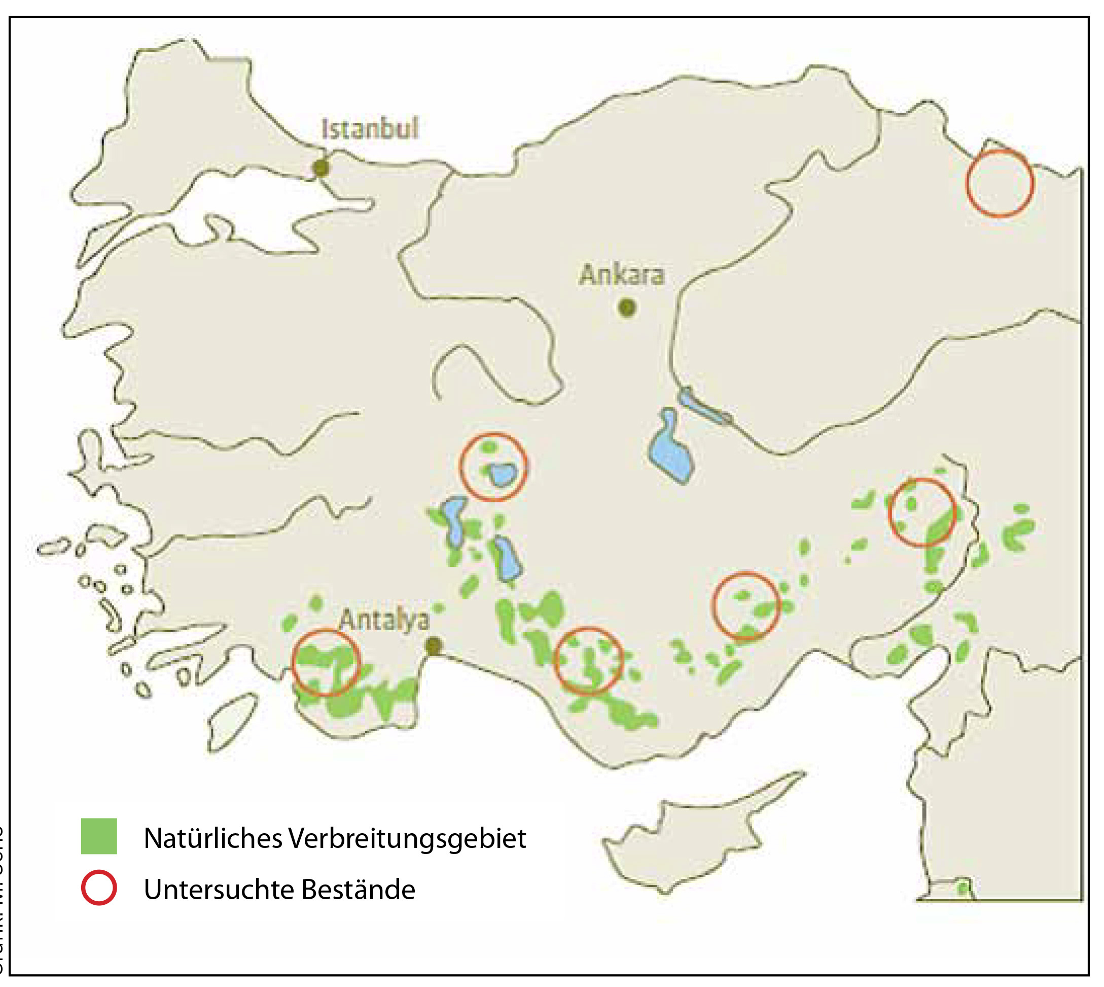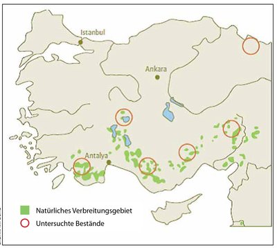 Die Frage der Saatgutversorgung geeigneter Herkünfte für bayerische Wälder wurde bisher nicht untersucht. Im Rahmen des vom Bundesministerium für Landwirtschaft und Ernährung geförderten Projekts "CorCed" wurden mehrere Saatguterntebestände der Libanonzeder in der Türkei besichtigt. Ziel war es, unterschiedliche klimatische Bedingungen und Höhenlagen abzudecken, um das Potenzial der dürretoleranten Baumart in Herkunftsversuchen in Bayern und Baden-Württemberg bewerten zu können. Die Bedeutung der Herkunft spielt bei der Libanonzeder wie bei anderen heimischen und nicht heimischen Baumarten eine zentrale Rolle. Neben den wachstumsrelevanten Merkmalen ist die genetische Ausstattung der einzelnen Populationen wichtig, um das Anpassungspotenzial einschätzen zu können.