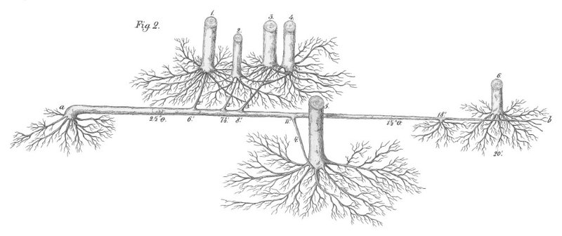 Abb. 2: Ausgegrabene Absenkergruppe mit sechs Absenkerpflanzen. Der Mutterstamm ist 6,1 m lang, der Durchmesser bei 1,3 m beträgt 6,1 cm. Quelle: Lithografie aus Burckhardt (1857)