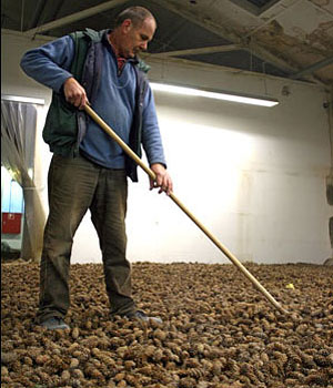 Abb. 2: Zur Vermeidung von Fäulnis harkt Forstwirt Rainer Ständer die Douglasienzapfen täglich durch. Foto: J. Preller