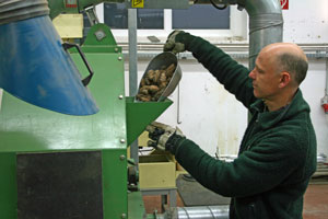 Doch der Weg zum fertigen Saatgut, das der Landesbetrieb Wald und Holz NRW an Forstbaumschulen verkauft oder dorthin als Lohnanzucht für den Staatswald abgibt, ist aufwendig und durch mehrere Arbeitsschritte in Spezialmaschinen geprägt. Anders als andere Bundesländer verfügt Nordrhein-Westfalen über keine großen Saatgutbearbeitungsmaschinen in öffentlicher Hand. Die Maschinen des Lehr- und Versuchsforstamtes Arnsberger Wald sind von der Dimension so gehalten, dass insbesondere kleinere Mengen Saatgut gut verarbeitet werden können. Denn oft handelt es sich bei den Früchten um seltene Gehölzarten wie dem Wildobst oder ganz bestimmte Herkünfte in eher geringen Mengen.