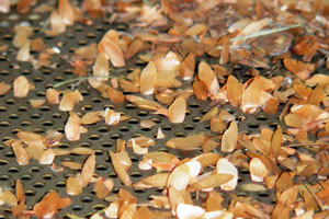 Nach der Trocknungszeit im Zapfenlager beginnt der Weg des Saatgutes in der Darre. Dort, bei warmer Luft und ständiger Rotation, werden die Zapfen und Samen voneinander getrennt. Ergebnis der Klengung mit einem anschließenden Reinigungsgrad von etwa 80 Prozent ist ein Gemisch aus Zapfenbestandteilen, Nadeln und geflügelten Samen.
