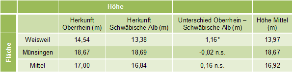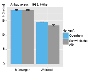 Beim Anbauversuch von 1985 erreichten im letzten Winter die inzwischen 33-jährigen Bergahorne eine Höhe von fast 17 Metern im Durchschnitt (Tab. 2, Abb. 4). Auf der Fläche Weisweil in der planaren Zone war die oberrheinische Herkunft mit einem Unterschied von 1,14 m signifikant höher als die schwäbische. Eine bessere Wuchsleistung wies die montan gelegene Fläche Münsingen auf. Dort waren die Unterschiede bei der Höhe zwischen den beiden Herkünften minimal und statistisch nicht signifikant. Somit erreichten die Bergahorne der Provenienz Oberrhein auf der Schwäbischen Alb die gleiche Höhe wie die dort autochthonen schwäbischen Provenienzen.