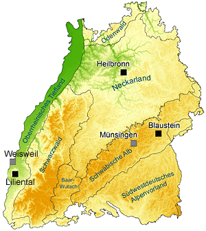 Abb. 2: Lage der Versuchsflächen des Anbauversuches von 1985 (graugefüllte Quadrate) und der Nachkommenschaftsprüfung von 1999 (schwarzgefüllte Quadrate) in Baden-Württemberg. Die verschiedenen Wuchsgebiete werden voneinander abgegrenzt und benannt (in blauer Schrift).