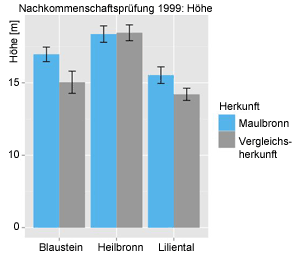Bei der Nachkommenschaftsprüfung von 1999 betrug die Höhe im Alter 15 im Durchschnitt über alle Herkünfte und Flächen 11,50 m. Insgesamt betrachtet waren die Bergahorne aus der Samenplantage Maulbronn mit einem Unterschied von 1,06 m signifikant höher als die jeweiligen Vergleichsherkünfte (Tab. 3). Auch auf lokaler Ebene waren sie in 2 von 3 Fällen höher als die jeweilige Vergleichsherkunft (Abb. 5). In Blaustein (Schwäbische Alb, montane Stufe) betrug der Unterschied sogar 1,93 m. Nur auf der Fläche bei Heilbronn konnte dieser Trend nicht bestätigt werden. Dort unterschieden sich die Höhen der beiden Prüfglieder nicht signifikant voneinander, das heißt, Vergleichsherkunft und Samenplantage Maulbronn wiesen eine ähnlich gute Wuchsleistung auf.