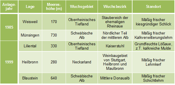 1996 begann die Samenplantage Maulbronn in wirtschaftlich ausreichendem Maße zu fruktifizieren. Somit bot sich die Gelegenheit, die ersten Nachzuchten für eine Nachkommenschaftsprüfung zu verwenden, um die Qualität der Samenplantage über mehrere Standorte hinweg zu prüfen. Als Vergleich diente Pflanzmaterial aus den drei in Baden-Württemberg für Bergahorn relevanten Herkunftsgebieten: Oberrheingraben (801 05), Süddeutsches Hügel- und Bergland, kolline (801 08) und montane Stufe (801 09). Diese Pflanzen wurden zugekauft. Je nach Lage der Versuchsfläche wurde als Vergleichsherkunft Pflanzgut aus unterschiedlichem Herkunftsgebiet verwendet. 1999 wurden mit dem Pflanzmaterial aus der Samenplantage Maulbronn und den Vergleichsherkünften vier Versuchsflächen begründet. Drei davon konnten jetzt ausgewertet werden, die vierte Fläche ist ausgefallen. Die Flächen befinden sich auf einer breiten Standortsamplitude, die planare, kolline und montane Lagen umfasst (Tab. 1, Abb. 2, Abb. 3).