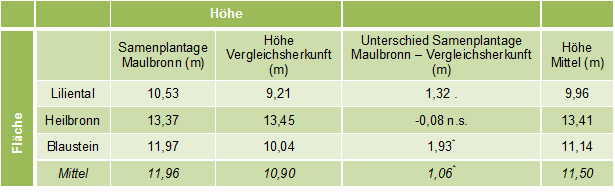 Tab. 3: Ergebnisse aus der Nachkommenschaftsprüfung der Serie 1999: Höhe der Nachkommen aus der Samenplantage Maulbronn im Vergleich zur lokalen Vergleichsherkunft im Alter von 15 Jahren in Metern. Auf Signifikanz wurde mittels Varianzanalyse und Post-hoc-Tests nach der Methode Tukey-HSD getestet.