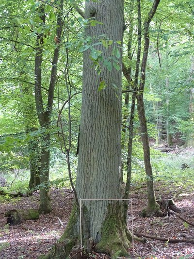 Der dritte zugelassene Erntebestand, der aufgesucht wurde, liegt im Gemeindewald Wintrich des Forstamts Traben-Trarbach. Auf 360 bis 380 m ü. NN sind 9,0 °C Jahresdurchschnittstemperatur und circa 800 mm Niederschlag zu verzeichnen. Der 158-jährige Altbestand weist gute Vitalität, acht bis zehn Meter astfreie, gerade Schäfte und 80 bis 100 cm Brusthöhendurchmesser (BHD) auf (Abbildung 1).