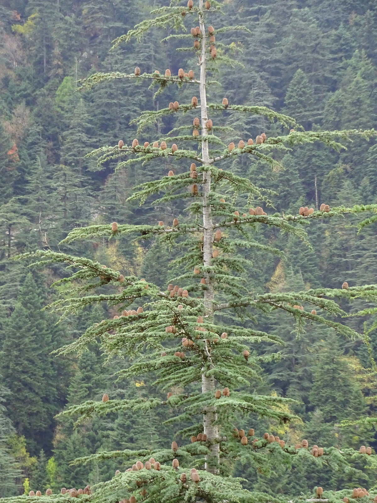 Die größten autochthonen Bestände der Libanonzeder stocken im Taurusgebirge im Süden der Türkei. Die begleitete Ernte wurde in dem ausgewählten Bestand Kahramanmaras-Andirin durchgeführt. Hier herrscht ein kontinentales Klima mit heißen Sommern und kalten Wintern. Die Jahresdurchschnittstemperatur beträgt 8,8 °C bei einem Jahresniederschlag von 650 bis 700 mm, der überwiegend im Winterhalbjahr fällt. Die Extremwerte der Temperatur schwanken von minus 32 °C bis plus 36,8 °C. Im ausgewählten Bestand wurden 41 Bäume beerntet, die über die ganze Fläche verteilt sind und mindestens 30 m Abstand zueinander haben (Abbildung 3). Von jedem Baum wurden genetische Proben zur Charakterisierung am AWG entnommen.