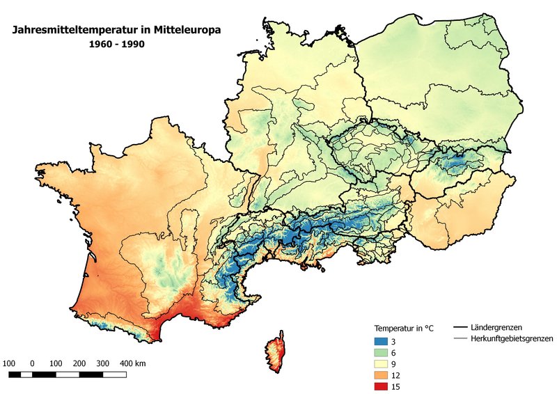 Abb. 3: Jahresmitteltemperatur der Länder- und Herkunftgebietsgrenzen in Mitteleuropa.