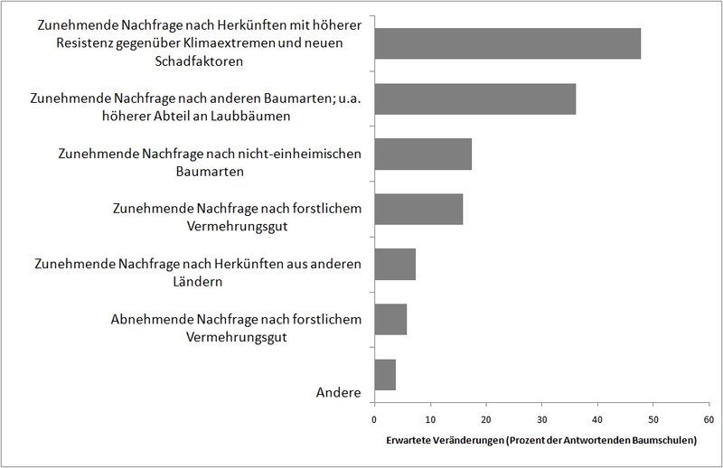 Sehr spezifische Auswirkungen auf Ihre Tätigkeit haben Forstbaumschulen: knapp 50% erwarteten eine verstärkte Nachfrage nach Herkünften mit höherer Resistenz gegenüber Klimaextremen und neuen Schädlingen. Zudem wird eine höhere Nachfrage nach anderen Baumarten erwartet. Die Nachfrage nach Pflanzgut aus anderen Ländern wird dagegen als gering eingestuft.