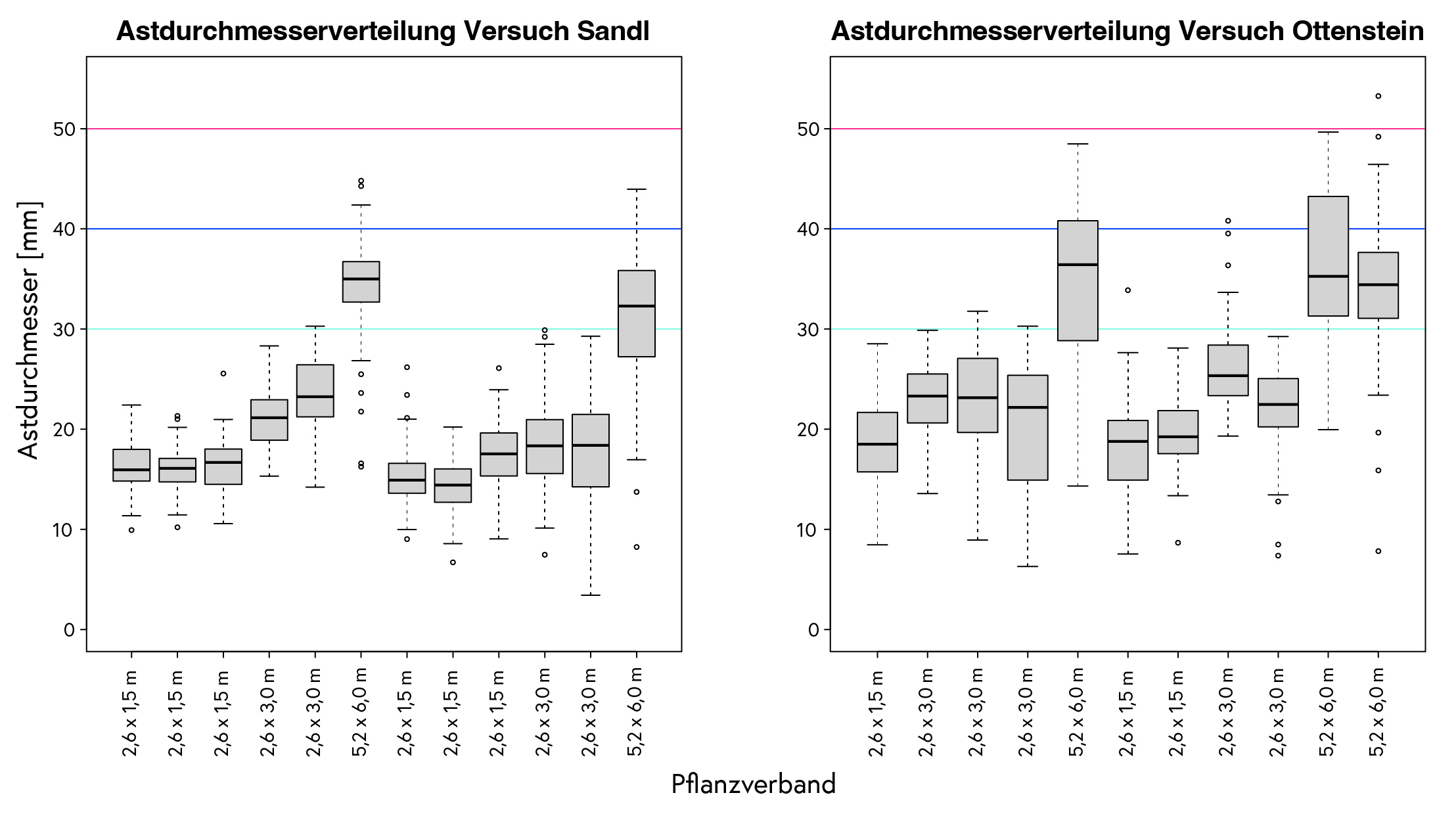 Wie zu erwarten war, wiesen die Versuchsflächen mit dem weitesten Pflanzverband (5,2 x 6,0 m) die größten Astdurchmesser auf. Grünäste wurden nur mehr auf den Weitverbandsflächen in Ottenstein vorgefunden, da sich der Kronenschluss auf diesen Parzellen gerade erst eingestellt hat. Diese lebenden Äste zeigten nur mehr eine äußerst geringe Vitalität und befanden sich kurz vor dem Absterben. Alle anderen aufgenommenen Äste waren bereits abgestorben. Bei den engen und mittleren Pflanzverbänden blieben die Astdurchmesser auf beiden Probeflächen weitestgehend unter 30 mm. Dies ist die Grenze für die unbeschränkte Anzahl an nicht fest verwachsenen Ästen für Blochholz der Güteklasse B mit einem Mittendurchmesser (MDM) von 20 -29 cm.